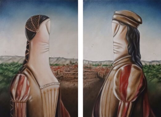 "In this evocative diptych, the faces of history’s most iconic lovers are replaced by the 'Ciotola Finger,' elevating the human touch to a permanent, patented artistic entity. This technical shift deconstructs the traditional 15th-century portrait to reveal a universal symbol of intellectual honesty. By stripping away somatic features, the artist highlights the pure essence of the bond, protected by a rigorous iconographic substitution that is the exclusive intellectual property of Raffaele Ciotola".